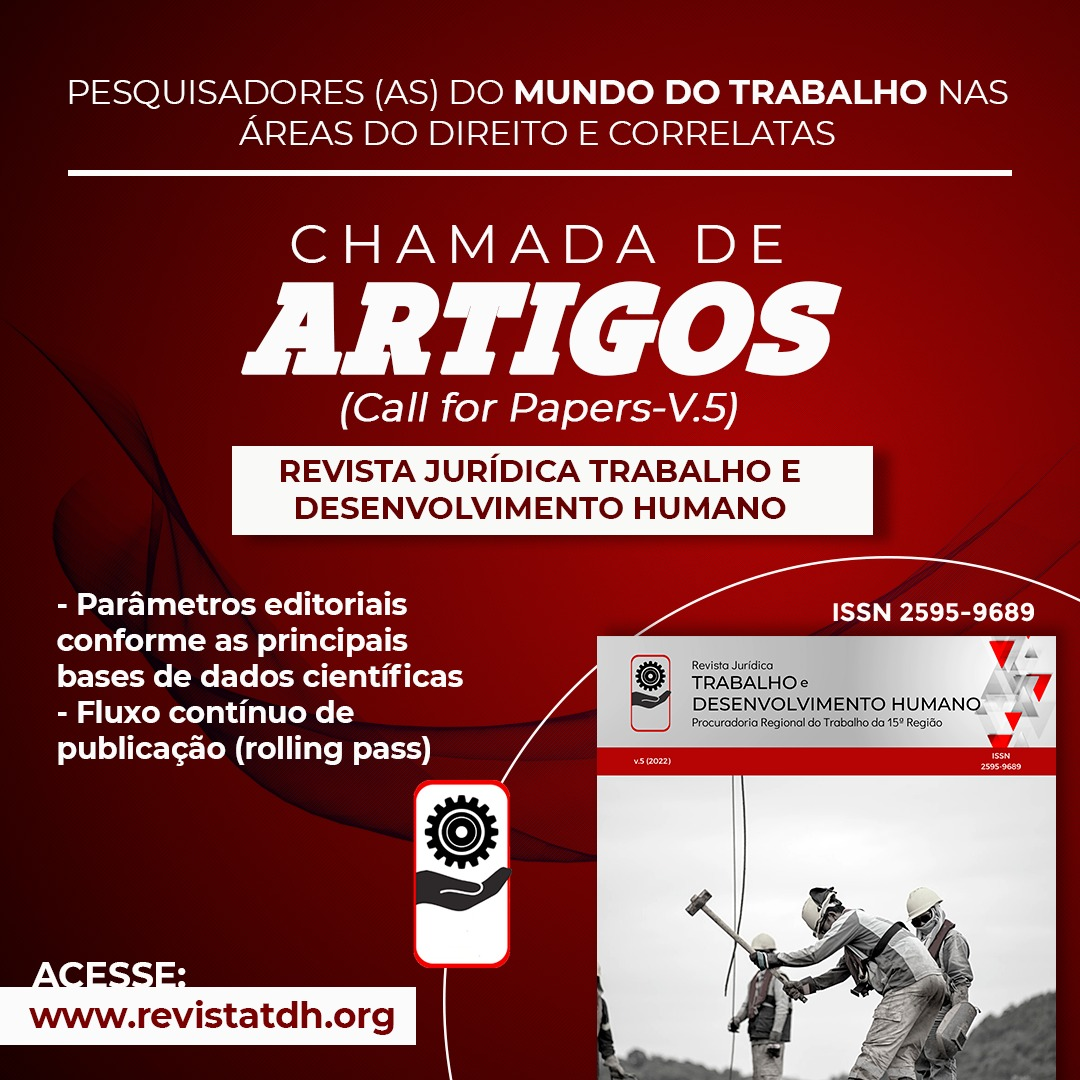 A Revista Jurídica Trabalho e Desenvolvimento Humano – Revista da Procuradoria Regional do Trabalho da 15ª Região (RJTDH) é uma publicação periódica que elege o fenômeno social do trabalho enquanto elemento do desenvolvimento humano como prioridade. Dedica-se a publicar estudos interdisciplinares, teóricos ou empíricos, atinentes às normas jurídicas e sua aplicação na sociedade. Busca fomentar reflexões rigorosas que possam orientar a redução das desigualdades materiais, com garantia de acesso de toda a população a um padrão de vida de qualidade e à observância de seus direitos básicos, sem discriminação por gênero, raça, idade ou orientação sexual.